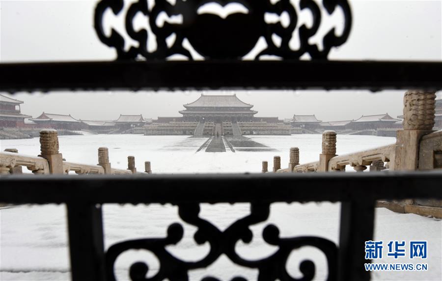12月16日拍摄的雪中的故宫太和殿广场。 当日,北京迎来降雪天气。 新华社记者 金良快 摄
