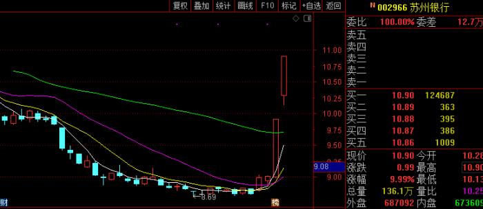 资管新规大概率延长过渡期的消息立刻引起市场狂欢,银行股连续两日上行,其中苏州银行表现最为强势,已经连续两日涨停,目前苏州银行的股价是10.9元,涨停板上还有将近14万手的买单。