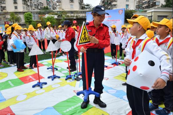 在室外交通安全实景演练课堂上,教官们把“汽车”搬进了校园操场,孩子们在大型交通安全充气车模前进行盲区站位演练,直观认识到车辆盲区的危险性;通过大型交通安全知识飞行棋,使孩子们以趣味竞技的方式,在游戏中快速记住常见的交通标志,从而对常见的交通安全知识有更加全面的认识和了解。