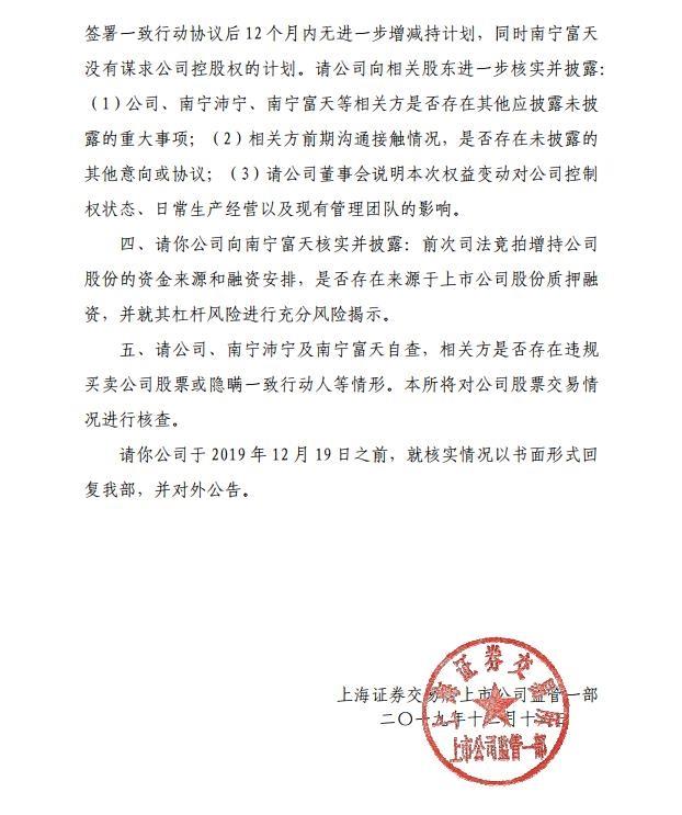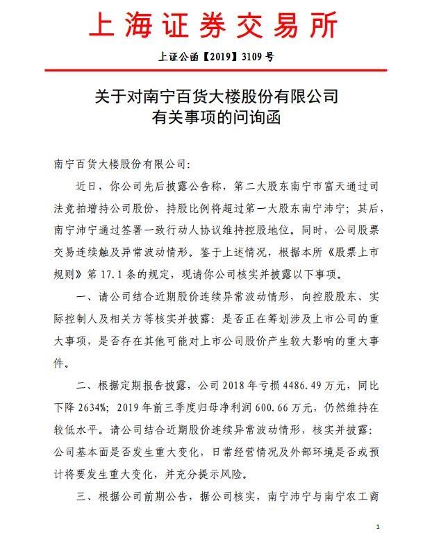 12月18日,南宁百货收上交所问询函,要求公司核实是否正在筹划涉及上市公司的重大事项,是否存在其他可能对上市公司股价产生较大影响的重大事件。公司基本面是否发生重大变化,日常经营情况及外部环境是否或预计将要发生重大变化,并充分提示风险。