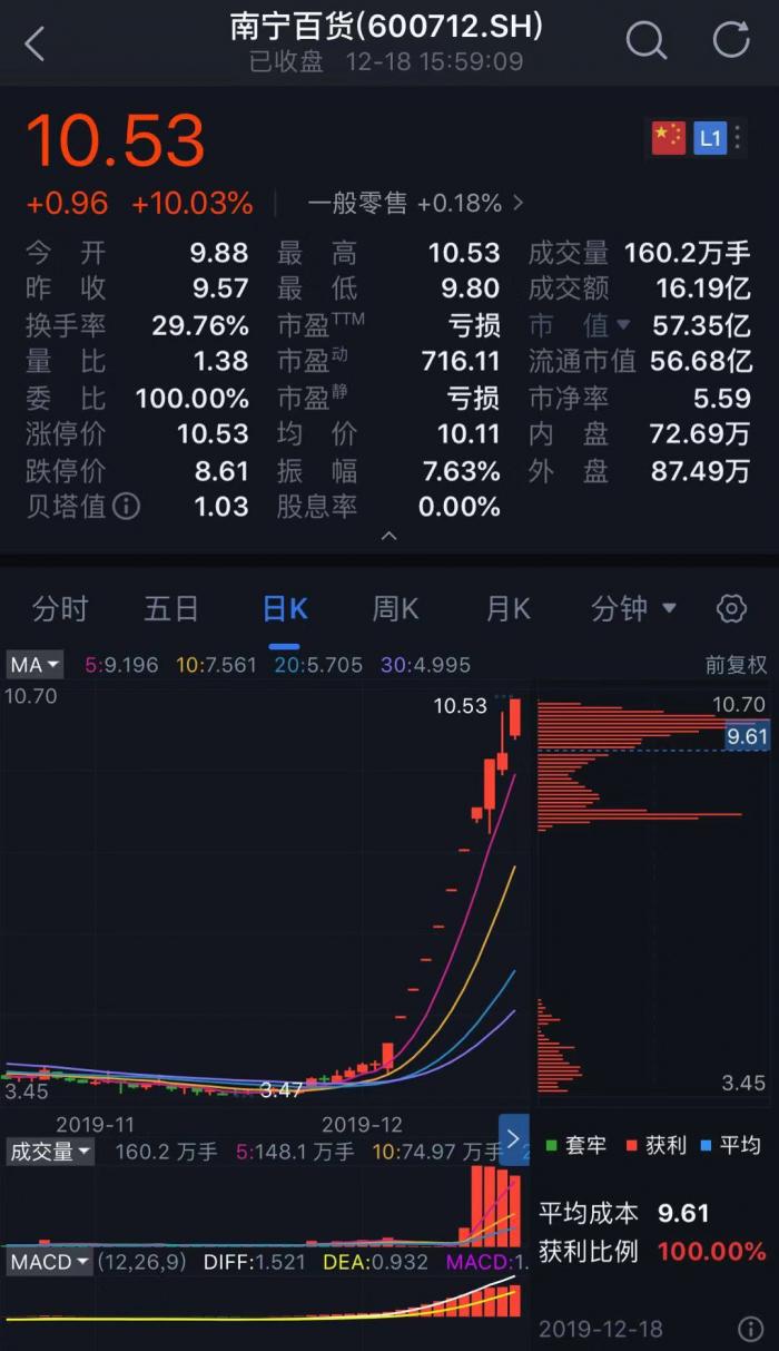 12月18日,南宁百货再度涨停,实现11天10板,成交额超16亿,换手率近30%!