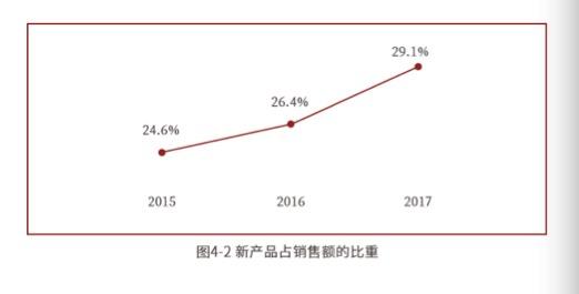 报告显示,企业逐渐重视创新发展。在创新投入方面,企业平均研发支出在2015年至2017年三年间平均增速15.4%。企业的创新产出效率不断增强,新产品销售从2015年的24.6%提升至2017年的29.1%,年均提升了2.3%。