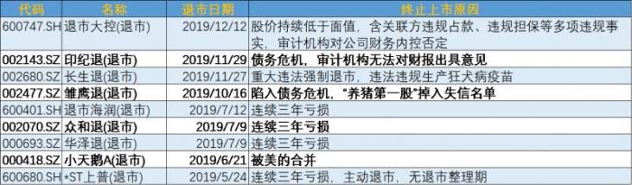 具体而言,2019年A股退市的公司分别为:退市大控(600747.SH)、印纪退(002143.SZ)、长生退(002680.SZ)、雏鹰退(002477.SZ)、退市海润(600401.SH)、众和退(002070.SZ)、华泽退(000693.SZ)、*ST上普(600680.SH)、小天鹅A(000418.SZ)。