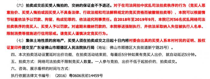 这还不是个例,顺德区法院在该笔拍卖的公告中也一再提示:对于在司法网拍中扰乱司法拍卖秩序的行为(竞买人恶意抬价、买受人悔拍或因买受人不具备法律、行政法规和司法解释规定的竞买资格而被撤销拍卖等),本院可以根据情节轻重依法予以罚款、拘留,构成犯罪的,依法追究刑事责任。自2018年至2019年9月,本院已对56名扰乱网络司法拍卖秩序的竞买人、买受人予以罚款。对逾期未缴纳罚款的,本院移送强制执行,并依法采取纳入失信被执行人名单、限制消费等措施进行信用惩戒。请竞买人谨慎决定竞买行为。