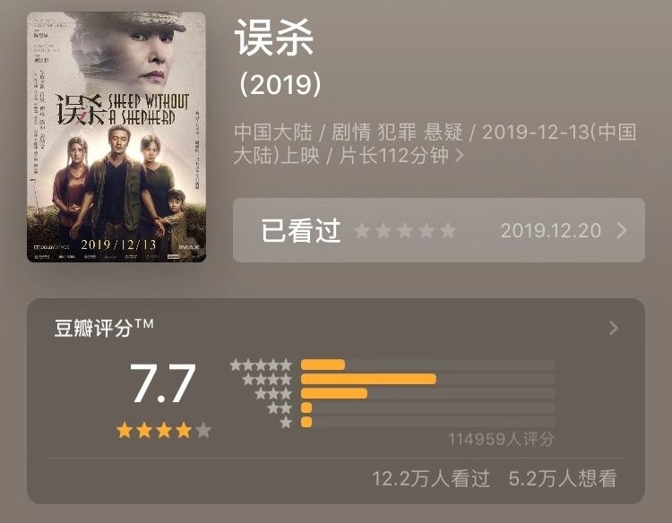 《误杀》无疑是2019年年底院线电影中的一匹黑马。自2019年12月13日上映以来,连续多日获得单日票房冠军,截至发稿日,累积票房已抵达3.4亿,豆瓣评分稳定在7.7分,好于81%的悬疑片。