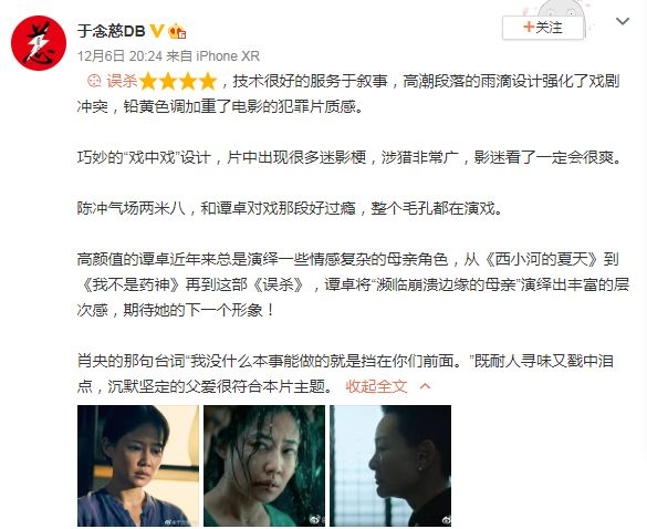 《误杀》的主演名单中,有肖央、陈冲、谭卓等演技在线的演员,陈冲饰演的督察长和谭卓饰演的母亲阿玉在警局里因为被侵犯的孩子和被杀死的孩子对峙的那场戏,大雨之中一众演员站立在墓地旁等待棺木被打开的那场戏,包括饰演安安的小演员张熙然在家人被打和来自督察长的恐吓下的不忍及哭泣,都让人动容。