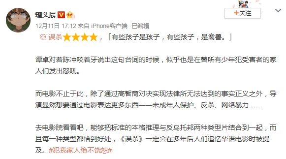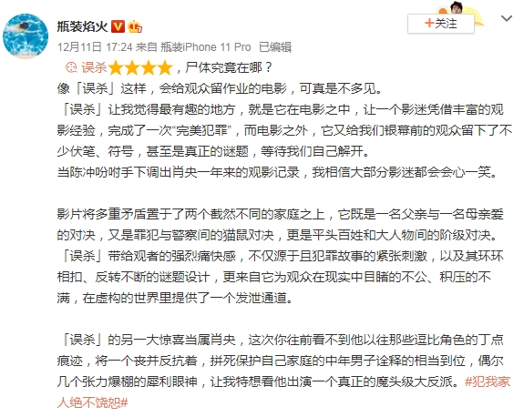 12月19日,电影《误杀》的相关话题#误杀小女孩演技##陈冲眼神#登上热搜,吸引不少人关注到这部年末国产犯罪片,影片中大量推理细节和破案解谜的爽感让观众大呼过瘾,触碰到的社会议题也引发大家讨论。城画君专访了《误杀》导演柯汶利,和他聊了聊这部电影的创作过程和心路历程。