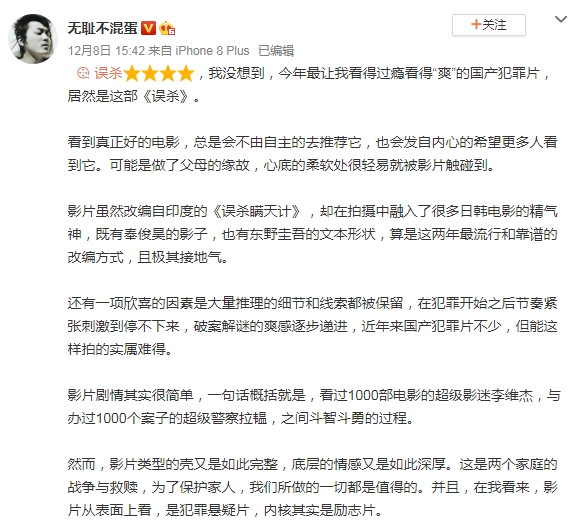 对于隐藏细节的讨论和故事的再次复盘将《误杀》的热度推至高点。而观影时所收获的体验和信息也足够让观众给《误杀》打上一个不错的分数。