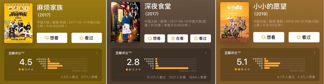 《麻烦家族》《深夜食堂》《小小的愿望》在豆瓣的评分。