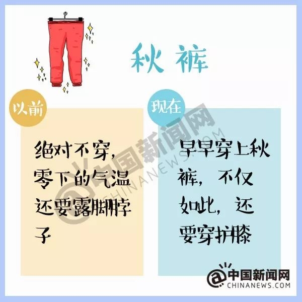 现在,在冷空气来之前就早早将秋裤准备好,不仅会在冬天来的时候穿上秋裤,还要把秋裤塞进袜子里,秋衣塞进秋裤里,顺便再穿上护膝。“秋裤真香”!