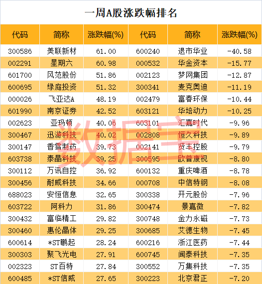少数股票出现大幅回落。数据显示,本周共计6股跌幅超过10%,分别是退市华业、华金资本、梦网集团、麦克奥迪、富春环保、华培动力。退市华业本周累计跌幅40.58%,此前因10月16日至11月12日连续20个交易日股价均低于面值,股票从11月13日起停牌,上交所启动对其股票的终止上市程序。12月12日复牌后,退市华业遭遇连续7个一字跌停,最新股价0.41元,目前,该股距离退市整理期满剩余23个交易日。