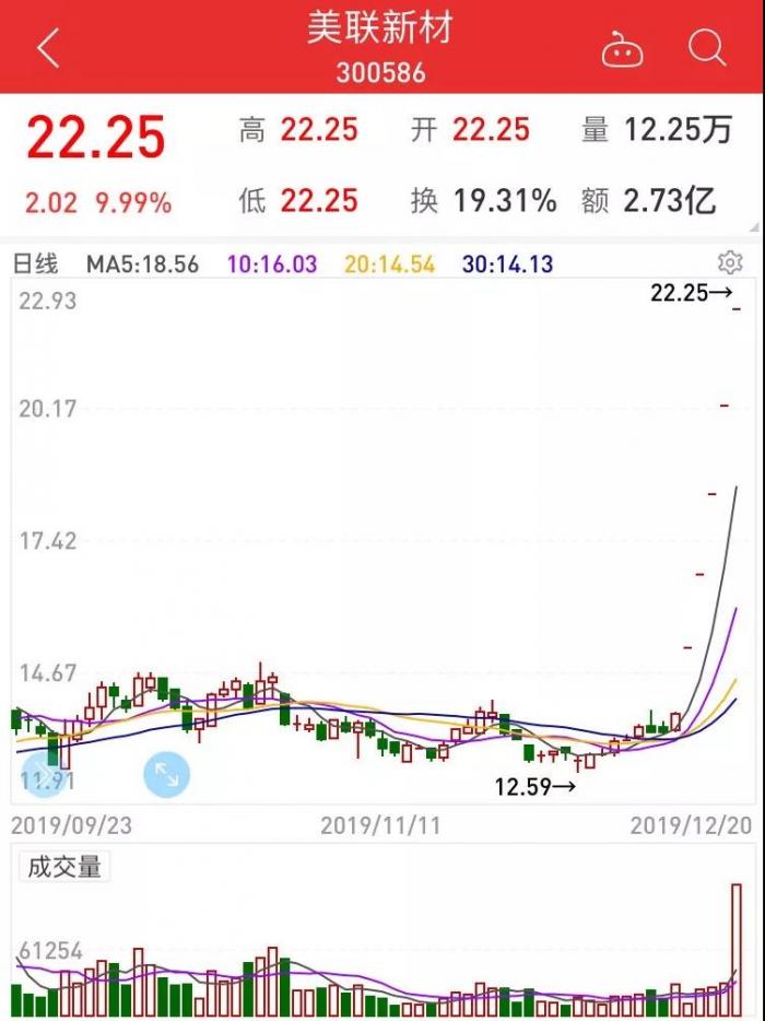 12月15日晚间,美联新材公布利润分配预案,公司拟向全体股东每10股转增6股、送红股3股及派发现金股利0.75元(含税)。在消息公布后,美联新材也因此打响了A股2019年报高送转的第一枪,公司股票瞬间成为市场关注焦点,周一开盘后美联新材被买爆,开盘时涨停板封单高达百万手,对应金额超过20亿元,而其流通市值还不到15亿元。