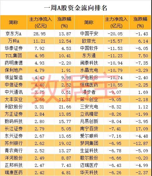 个股方面,剔除近一个月上市的次新股,本周共68股主力资金净流入超亿元。OLED概念龙头京东方A主力资金净流入28.95亿元居首,该股本周上涨13.87%。万科A、华泰证券主力资金净流入分别为11.21亿元、7.92亿元,两者分别累计上涨12.54%、4.53%。本周净流入规模较大还有的TCL集团、药明康德、保利地产、领益智造、中信证券等。