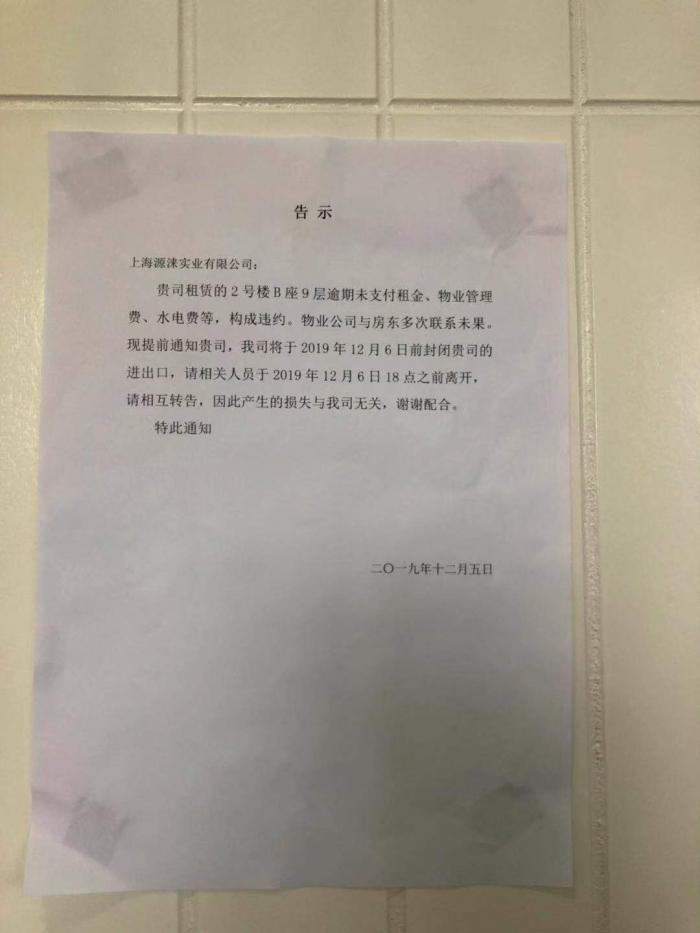 倾巢之下,岂有完卵?12月19日下午,记者前往位于上海市徐汇区某科技服务园某幢9层的源涞国际总部,发现该楼层电梯已无法正常使用。在该楼层后门,记者看到,由于拖欠租金、物业管理费和水电费,园区物业公司于12月6日封闭该楼层出入口,并派驻工作人员看守。