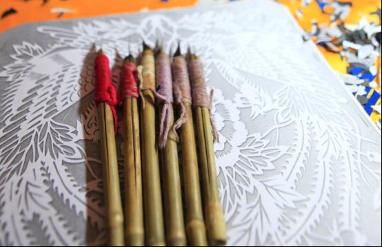 我见她正稳稳地握着笔刀,以垂直的角度在一沓钉紧的纸上细细地凿刻,刀尖过处,纸屑被不断分离出来,湘西当地的花鸟、人物等造型,一点点地显露出来。