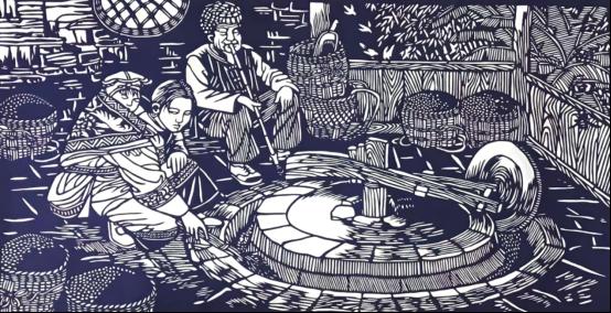 刘克梅从事踏虎凿花的时间已有11年,她的作品,既有高度的简练,也有动人的丰富。她向我展示了一幅获奖的剪纸作品《湘西碾米》,其中的服饰有着自然的褶皱和装饰,人物的表情安静而生动,还有湘西乡间常见的房屋、竹筐、石碾,她都试图用简练的线条来表达。