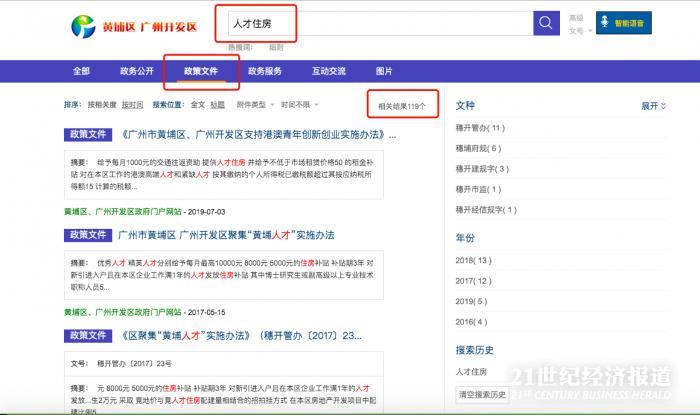 21世纪经济报道记者在广州黄埔区官方网站搜索“人才住房”关键词,选择政策文件选项,共有相关搜索119个。内容主要涉及:租房补贴,住房补贴,安家费,现金奖励,子女教育等。