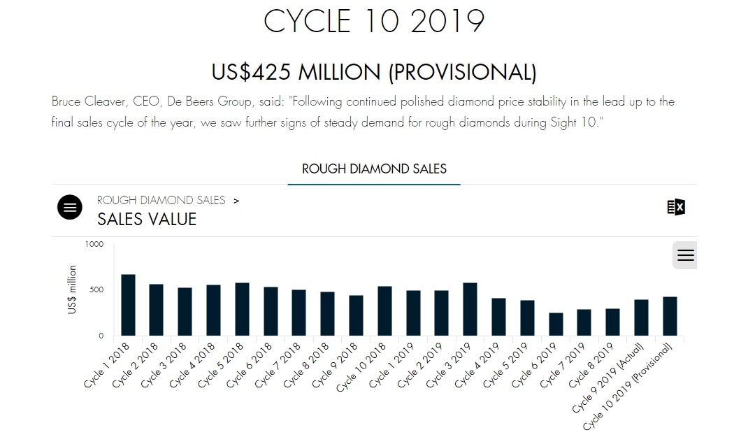戴比尔斯每年公布10次销售数据。本年度公布的最后一次销售数据,戴比尔斯的业绩较上一周期略微上涨了6.25%、至4.25亿美元,但与去年同期的5.44亿美元比,仍相去甚远。