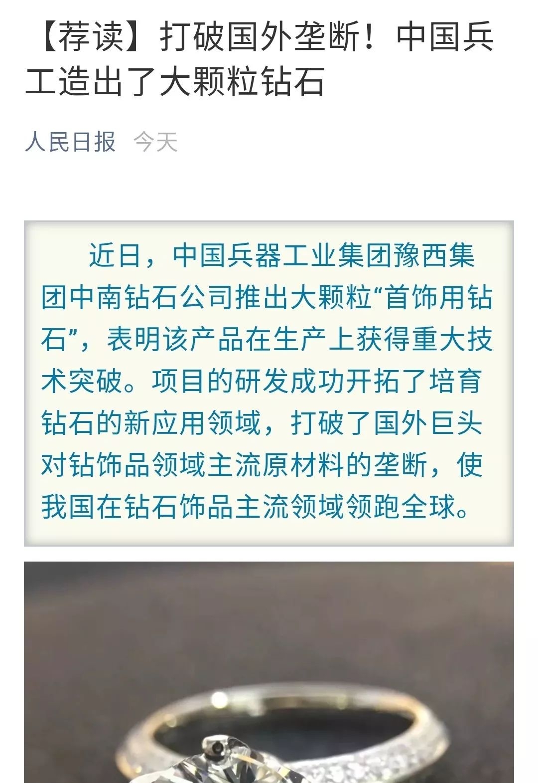 2019年5月,中国兵器工业集团豫西集团中南钻石公司推出大颗粒“首饰用钻石”。目前,豫西集团已掌握了20克拉以内大尺寸高温高压培育钻石单晶合成技术,掌握了黄钻、蓝钻、绿钻、紫-红钻等彩色钻石生产技术。实现了批量供应粒度最大、品级最优、色彩可控的克拉级培育钻石。
