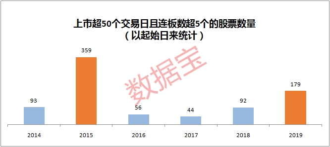衡量赚钱效应最简单的一个指标是市场连板数的放大。2014年以来,从上市超过50个交易日的股票连板情况来看,以连板起始日期来统计,近6年间仅有2015年及2019年连续涨停数超5个的股票数量(含重复股票)超百只。