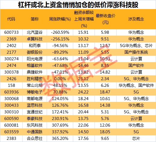 科技股行情下,最明显的特征就是板块轮动,几乎每隔几天,科技细分领域就会迎来一波上涨。数据表明,杠杆资金或北上资金加仓公司往往市场表现较为优异。还有哪些股票尽管获加仓,但股价较低,且涨幅低于板块平均水平。