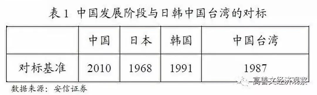 结合这两个指标的观察,我们确立了经济转型的对标年份,如表1所示,即中国2010年的经济发展程度、人均收入和生活水平大致接近于日本1968年前后的水平、韩国1991年前后的水平、中国台湾1987年前后的水平。