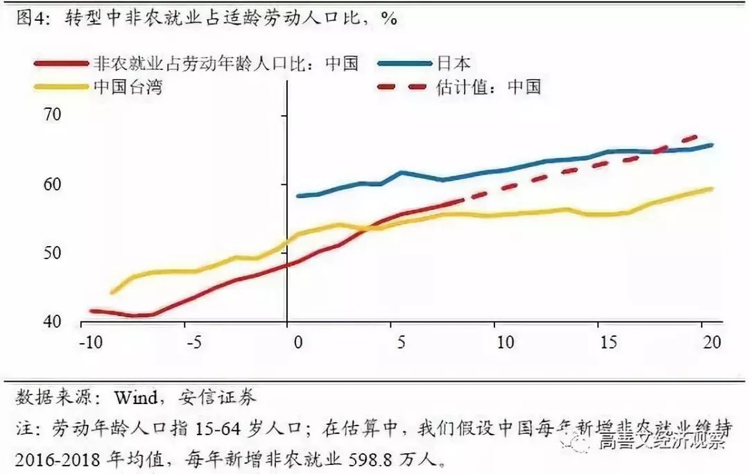 这些虚线的基本想法是,如果中国城市经济部门第二、三产业每年创造就业机会的能力维持在过去三年的平均水平,我国非农就业占全部适龄劳动人口的比例将逐步超过日本同一发展阶段的水平。