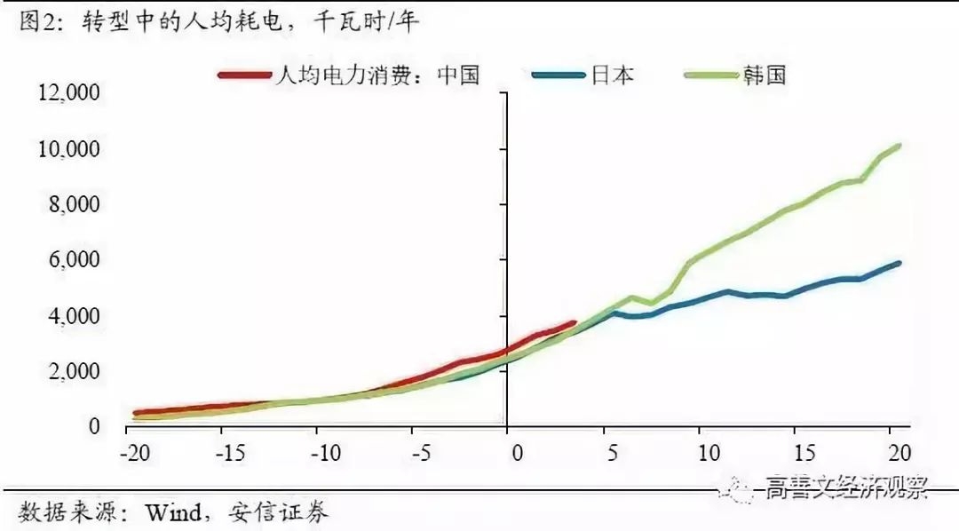我们沿着相同的思路比较了东亚经济体在转型阶段的人均电力消费量。