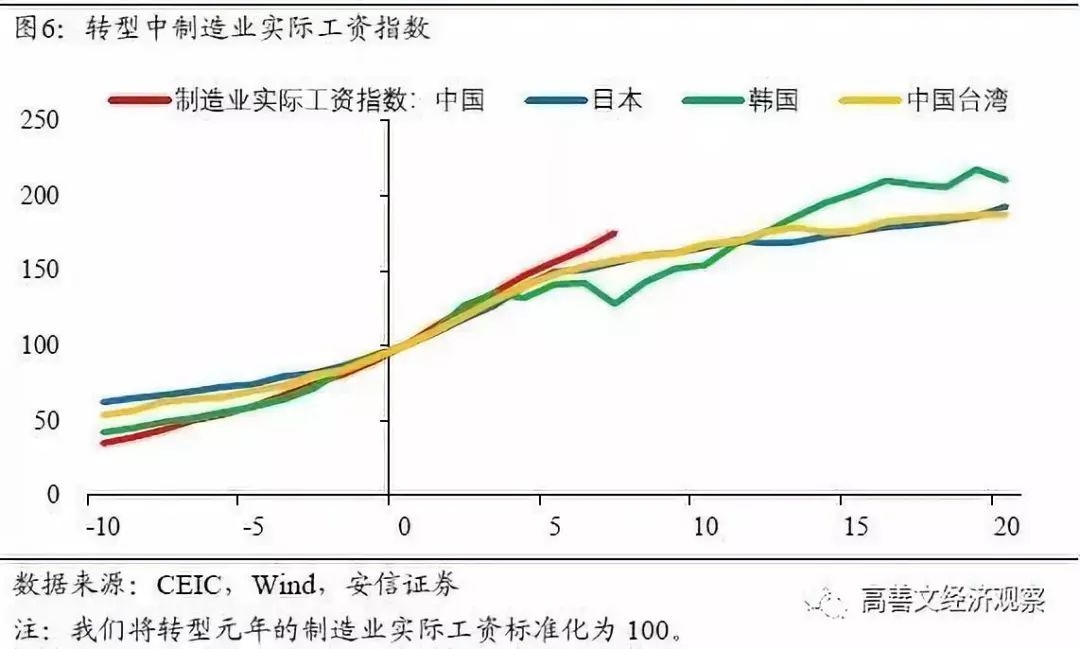 我们看到转型8年以后,中国以人民币计价的制造业实际工资的累积增长幅度明显高于日韩台同期的水平。