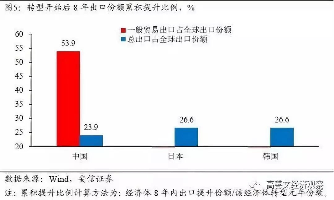 即便把加工贸易包括在内,我国整个出口份额的提升跟日韩同期也非常接近。