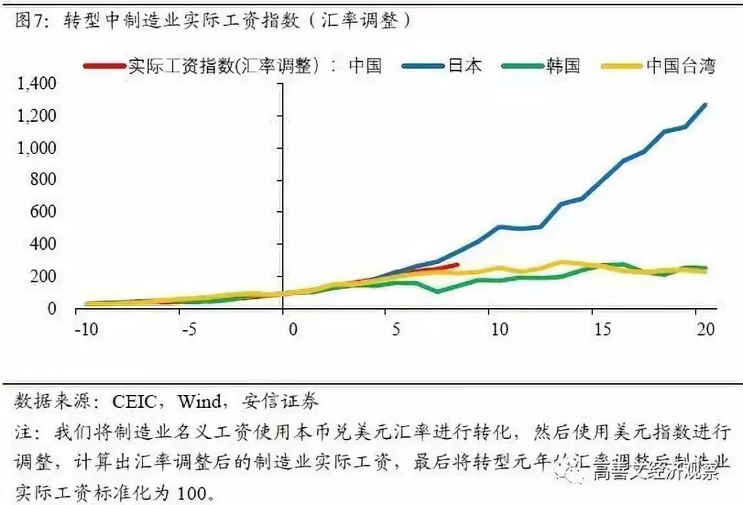 但该计算没有考虑汇率升值的影响,所以进一步,我们把工资水平用汇率转化成美元的水平,考虑美元币值的变化再做一些技术性调整后,进行比较。