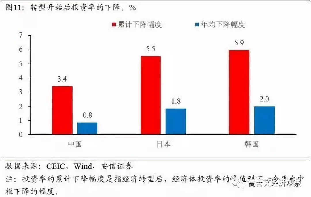 如图11所示,对日韩来讲,在经济开始转型以后,投资率从高点到重新稳定下来的累积降幅接近6个百分点,但迄今为止我国投资率的降幅大约只有3个百分点;而在年均投资率下降的对比中,日本、韩国平均每年下降约2个百分点,而我国每年平均降幅只有不到1个百分点。