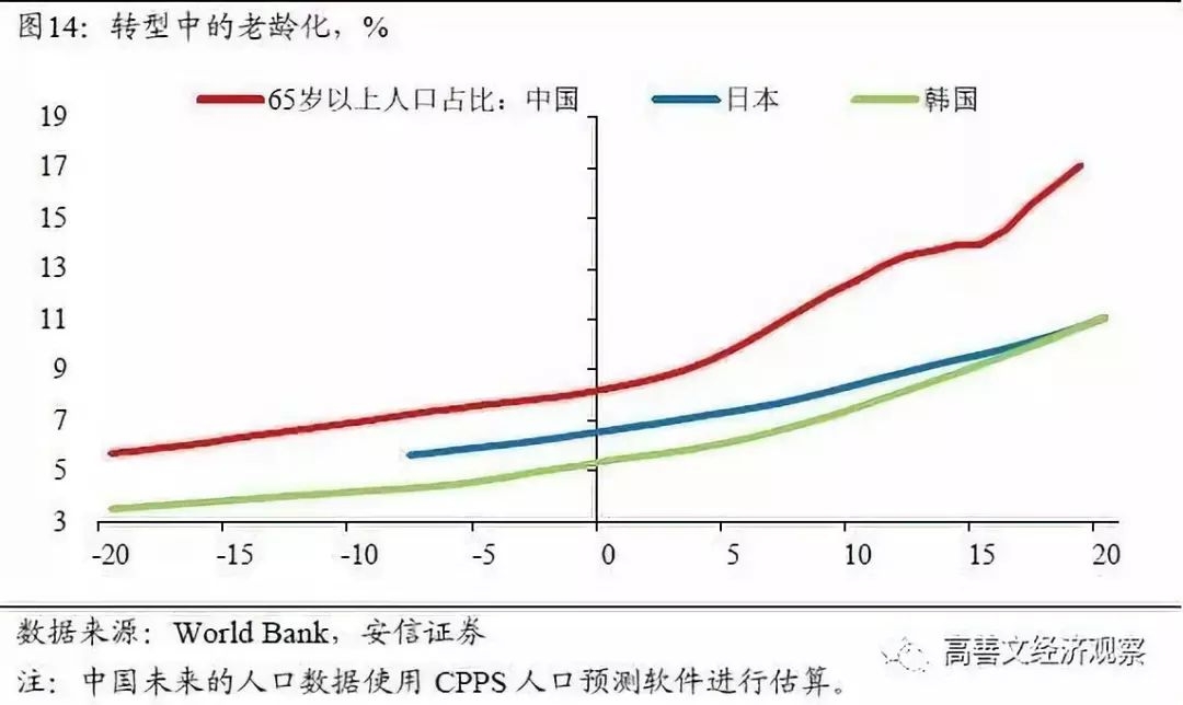 如图14所示,由于计划生育的影响,中国的老龄化程度始终高于可比时期其他经济体的水平,这一点在历史上一直如此。