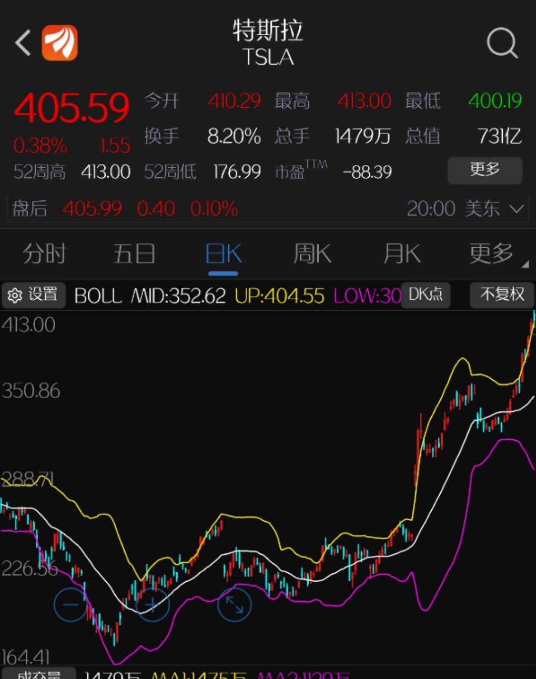 特斯拉股票在美股市场牢牢站稳400美元,截至12月21日下午收盘,特斯拉股票为405美元,市值高达731亿美元,已远远超越传统汽车龙头公司通用汽车,后者的最新市值为532亿美元。