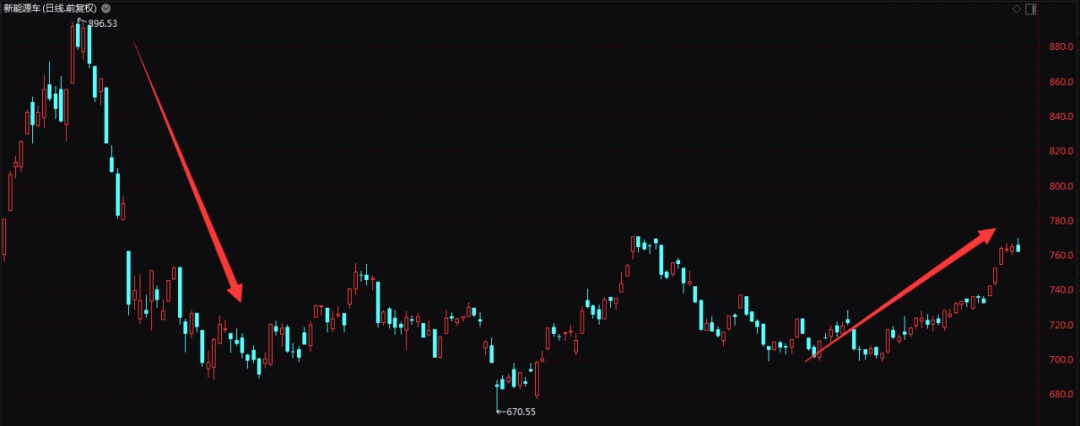 在今年二季度期间,中国A股的新能源汽车上市公司,也成为资金远离的对象,就像当时抛弃特斯拉的美股机构投资者。新能源车指数曾在8天时间内大跌近20%,不过进入,11月份后,新能源车指数开启了一轮上涨行情。
