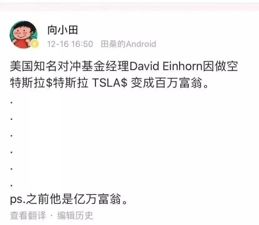 美国的明星基金经理、绿光资本创始人Einhorn就因为长期做空特斯拉,从而令其损失惨重,由于Einhorn坚信特斯拉必败,拒绝改变看空的态度,一些市场人士甚至担心,这位明星基金经理可能会从亿万富翁变成了百万富翁。