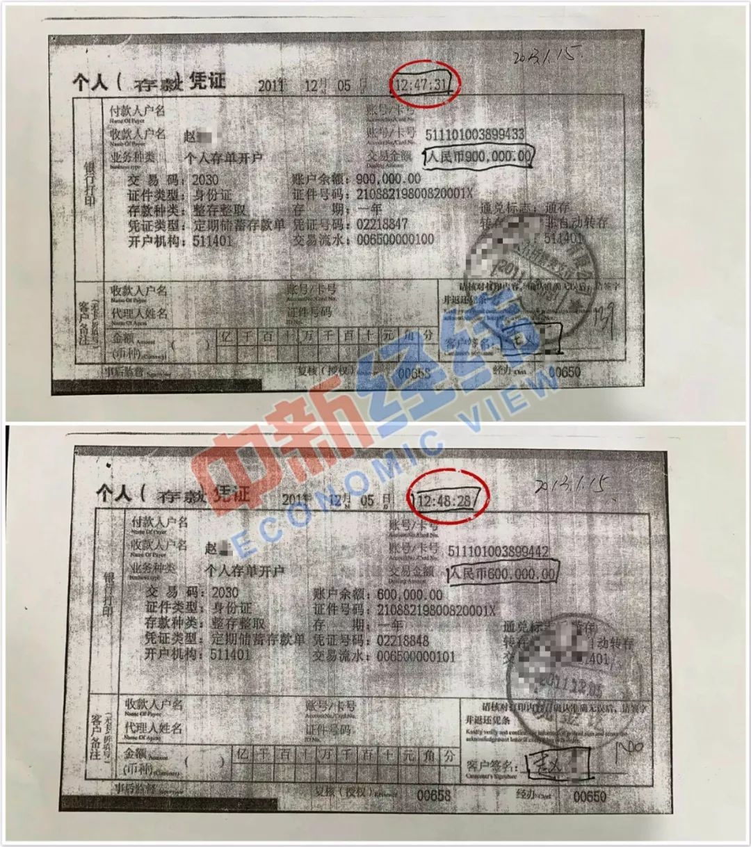 在开庭笔录中,该行又举证,2013年1月15日,一位名叫贾某某的男子在其个人账户中取款50万元,之后又从赵魁账户中取出90万、60万,并存成两张各100万元的存单。