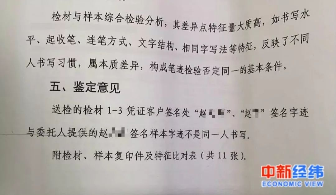 赵魁还向中新经纬记者提供了一份辽宁学苑司法鉴定中心进行的司法鉴定意见书,该鉴定意见书显示,委托人为营口市中级人民法院,鉴定意见还称,送检材料中客户签名处“赵启明”、“赵魁”签名字迹与委托人提供的赵启明、赵魁签名样本字迹不是同一人书写。