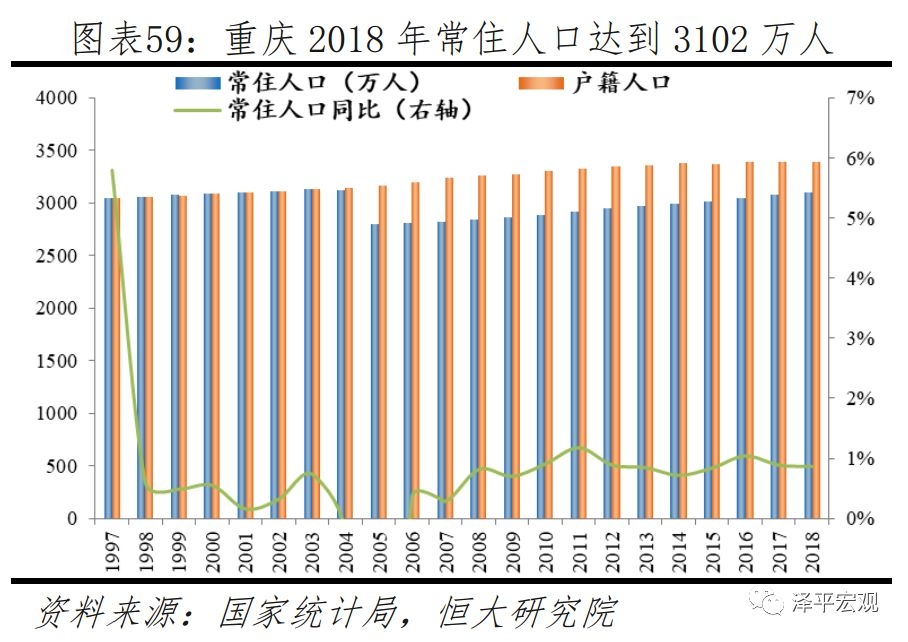 大重庆在2018年成为上海、北京、深圳、广州之后,第五个GDP突破2万亿的城市,小重庆人均GDP为9.1万元,略低于成都。古时重庆为西南军事重镇,19世纪末被辟为对外商埠,至此重庆开始凭借其水陆集散的优势不断发展起来,并不断追赶四川地区的传统中心成都。抗战时期作为陪都成为当时全国的政治中心、能源中心和金融中心。1980年代抓住改革开放的新浪潮默默改变,积蓄力量。中央考虑到,设立重庆直辖市不仅有利于解决四川省面积过大、人口过多、难于管理的问题,而且有利于加快四川省和重庆市的经济发展,带动西南地区和长江上游地区的经济开发,有利于三峡工程建设和做好移民工作,1997年重庆成为西部唯一的直辖市。2018年重庆成为上海、北京、深圳、广州之后,第五个GDP突破2万亿的城市,人均GDP达6.6万元,常住人口达3102万人。作为中西部最重要并且根出同源的两座城市,重庆和成都并称为“西南双核”。重庆全域面积8.2万平方公里,是海南省的2.4倍,成都市的5.6倍。从可比性角度考虑选取重庆主城区,即主城九区以及未来有望被纳入主城区范围的璧山、江津、合川。2017年重庆主城区常住人口为1209万人,GDP为1.1万亿,人均GDP9.1万元,与成都接近。交通区位方面,重庆是是长江上游地区唯一汇集水、陆、空交通资源的城市,有着成都无可比拟的水上交通优势;作为西南地区综合交通枢纽,共建成了“二环十射”高速公路网和“一枢纽八干线”铁路网。教育方面,重庆拥有高等院校65所,其中有1所985,1所211。医疗方面,重庆拥有三甲医院29家,5家医院跻身中国医院排行榜Top100。