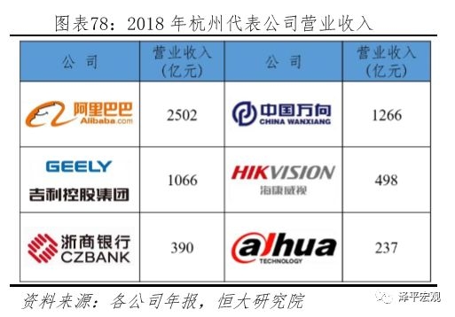 杭州民营经济占GDP比重达到61%,以信息软件、电子商务、物联安防等为代表的数字经济发展全国领先。改革开放初期,杭州是中国重要的工业城市之一,1979年工业增加值占GDP的比重达到35%;1990年代,由工业开始向高新科技产业、服务业转型。2018年三产占比达到64%,全国第四。杭州是我国民营经济最为活跃的区域之一,从80年代的鲁冠球、宗庆后,到90年代的李书福,再到互联网时代的马云,数以万计的创业型企业书写着中国民营经济的“杭州故事”。2018年杭州民营经济增加值达到8175亿元,占GDP的61%。杭州市在“十三五”规划纲要中明确提出打造“1+6”产业集群,打造一大万亿信息产业集群和文化创意产业、旅游休闲产业、金融服务产业、健康产业、时尚产业、高端装备制造产业等六大千亿产业集群。目前杭州以信息软件、电子商务、物联安防等为代表的数字经济发展全国领先。2018年数字经济核心产业增加值3356亿元,占GDP的24.8%,阿里巴巴、蚂蚁金服、口碑网、菜鸟网络等企业是典型代表。除此之外,杭州积极发展新零售,盒马鲜生、网易严选、未来鲸选等新业态蓬勃发展。