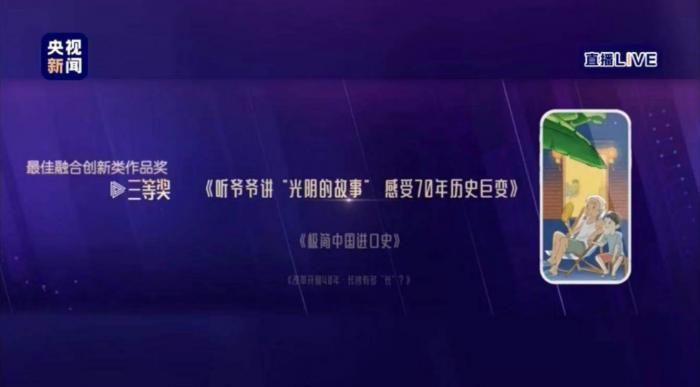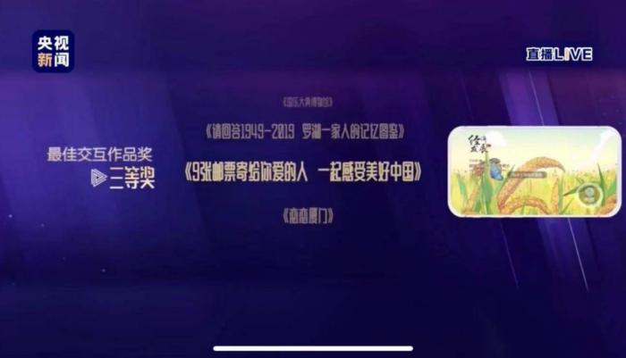 12月23日,第二届“你好新时代——中国永远在这儿”融媒体作品大赛颁奖盛典在广州举行。由南方财经全媒体集团官方客户端21财经APP选送的作品《H5丨听爷爷讲“光阴的故事”,感受70年历史巨变》获得融合创新作品类三等奖,《H5丨9张邮票,寄给你爱的人,一起感受美好中国》获得交互作品类三等奖。