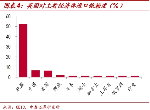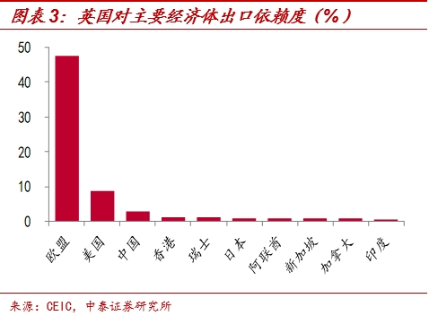 欧盟是英国最主要的贸易伙伴,无论是出口还是进口,英国对欧盟的依赖度都接近五成,脱欧后英国贸易将最先遭到冲击。由于欧盟内部实行的是零关税政策,无任何贸易壁垒,我们可以看到,欧盟是英国最大的出口经济体,占英国全部出口额的47.6%,而美国和中国仅占8.8%和3.1%;同时,欧盟也是英国最大的进口经济体,占英国全部进口额的52.3%,而中国和美国仅占6.7%和6.6%。脱欧后,英国贸易将最先受到影响,根据伦敦政治经济学院(LSE)在2019年10月的估算,约翰逊的脱欧协议将导致英国贸易下滑13个百分点。