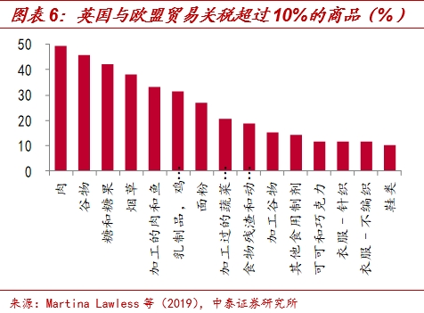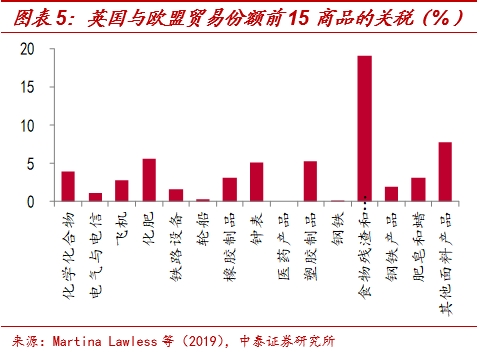 商品贸易中受影响最大的或是服装和食品,贸易减少或超90%。尽管,英国未来的贸易状况与脱欧后英国和欧盟的相处模式有关,但无论采用何种模式,两者之间的零关税政策将不再适用。根据Martina Lawless和Edgar L. W. Morgenroth(2019)的研究,脱欧后英国与欧盟贸易份额前15的商品将有0%-19%不等的关税,贸易份额最高的化学化合物的关税为3.95%;而就具体关税来说,食品类商品如肉、谷物、糖等关税最高,均超过40%。不仅如此,遭受贸易打击最大的或是服装和食品,服装贸易将下降99%,而乳制品、鸡蛋和蜂蜜部门以及糖和糖制品部门的贸易将分别下降68%和95%。