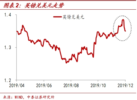 脱欧或成定局。保守党在大选中大获全胜,成为近些年来席位最多的一次,作为多数党的好处在于首相能够顺利得到议会的立法支持。因此,脱欧的进程会加快进行,加之12月20日约翰逊的《脱欧协议法案》二读在议会中通过,预计英国将在2020年1月31日(脱欧的最后期限)前顺利脱欧。无协议脱欧风险仍存。12月20日通过的《脱欧协议法案》较10月法案做了部分变更,其中关键的一条是禁止延长脱欧过渡期(当前截止2020年12月31日),这意味如果英国在明年1月底完成脱欧,那么留给英国和欧盟进行自由贸易协议谈判的时间仅10-11月。如果谈判不成功,英国仍可能面临硬脱欧,无协议脱欧风险仍存。受此影响,英镑再度大跌,自12月16号以来已经下跌了2.5%。