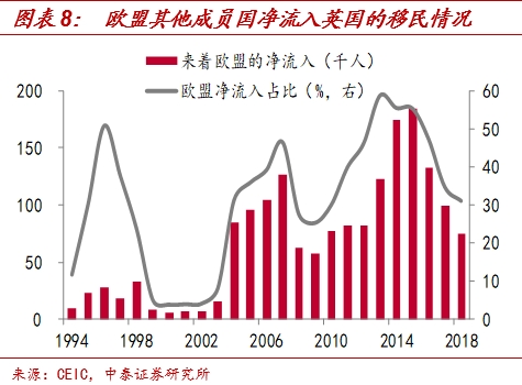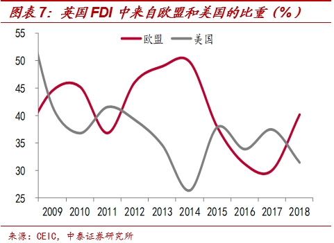 除此之外,受脱欧影响波及,英国的投资吸引力将下降,就业也可能下滑。由于英国和欧盟经济贸易往来密切,英国管制较少,资本市场相对发达,英国外商直接投资(FDI)中40%以上来自欧盟。一旦脱欧,英国经贸形势将受到影响,且英国的跨国公司想要在欧盟经营业务可能需要重新获取牌照,这将导致投资的吸引力下滑。据安永2019年9月发布的报告显示,其持续追踪的222家金融服务公司中有约40%计划将部分业务和员工迁出英国,且脱欧后可能有约1万亿英镑资产转移出英国。同时,英国也是典型的老龄化国家,截止2018年60岁以上和65岁以上人口占总人口比重分别为23.8%和18.3%,远高于联合国10%和7%的传统标准。尽管大量的移民在一定程度上增加了英国的负担,但也帮助缓解了英国人口老龄化问题,脱欧后不确定的移民政策,以及受损的经贸,会在一定程度上致使整体就业的下滑,也不利于经济的长期增长。