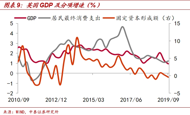 脱欧将拖累英国经济。今年以来,英国经济一直处于下滑的趋势,三季度GDP增速仅0.97%,创2010年一季度以来新低。而脱欧将带来一定的关税壁垒和非关税壁垒,加之不确定的移民政策,会进一步拖累英国经济的增长。根据伦敦政治经济学院(LSE)在2019年10月的估算,在乐观情景下,约翰逊的脱欧协议将导致英国GDP下降0.7个百分点,悲观情景下降低0.9个百分点;如果考虑生产率增速放缓等因素影响,脱欧对英国GDP的拖累更严重,乐观情景下损失1.9个百分点,悲观情景下损失2.2个百分点。