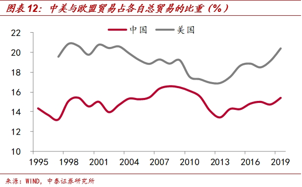 除此之外,英国脱欧对中美的贸易也有一定冲击。一方面,中美与欧盟之间有较强的贸易联系,今年以来,无论从出口还是进口来看,欧盟都是中国第一大贸易经济体,前11月中国与欧盟的贸易量超过6000亿美元,占其贸易总量的15.4%;而今年前10月,美国与欧盟的贸易量接近8000亿美元,占其总贸易量也高达20.4%。可见,无论脱欧后,英国与欧盟之间的贸易模式如何,英国和欧盟的经贸会遭到冲击,因而中美在全球的贸易也将受到影响。