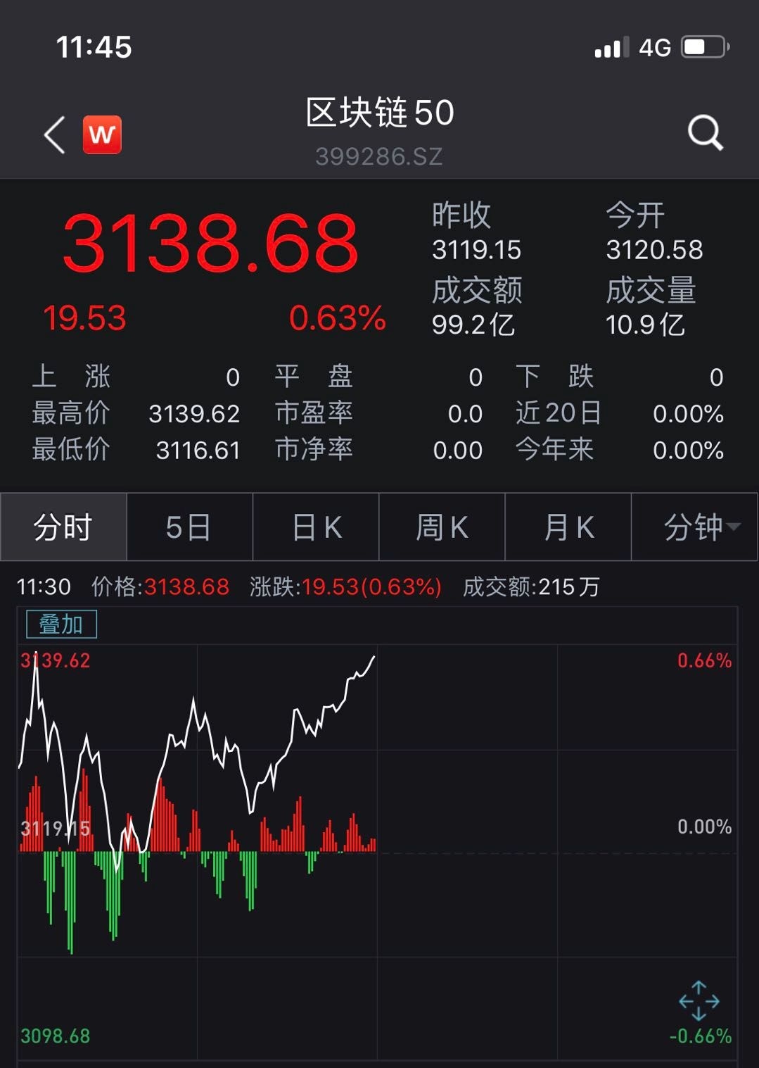 区块链50发布首日,早盘表现亮眼。截至中午收盘,该指数上涨0.63%,报3138.68点。而沪综指早盘上涨0.25%。