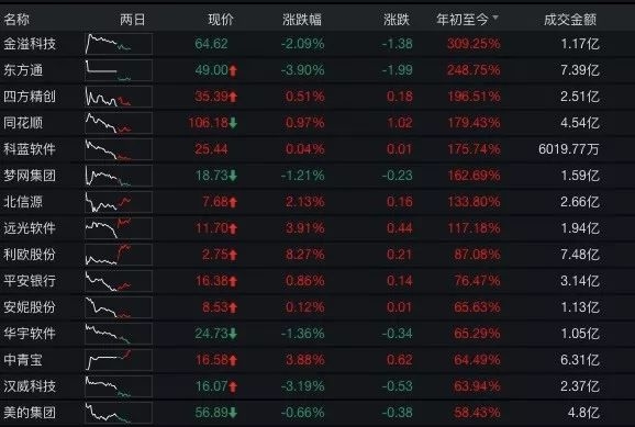 值得注意的是,该板块内多只个股年内涨幅惊人。涨幅超过100%的个股有8只,包括金溢科技、东方通、四方精创、同花顺、科蓝软件、梦网集团、北信源、远光软件。金溢科技以309.95%的涨幅居首。
