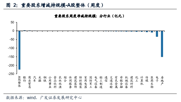 (2)重要股东增减持(A股整体):上周重要股东净减持约225亿元,前一周净减持约65亿元。其中银行、商贸、汽车等为净增持行业;减持规模前三为房地产、电子、医药生物。